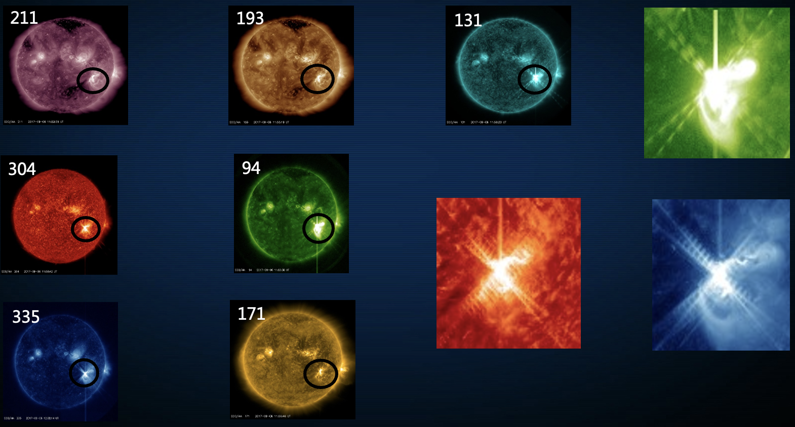 图1、SDO/AIA极紫外太阳图像的饱和现象(多个波段上的曝光、曝光原理)